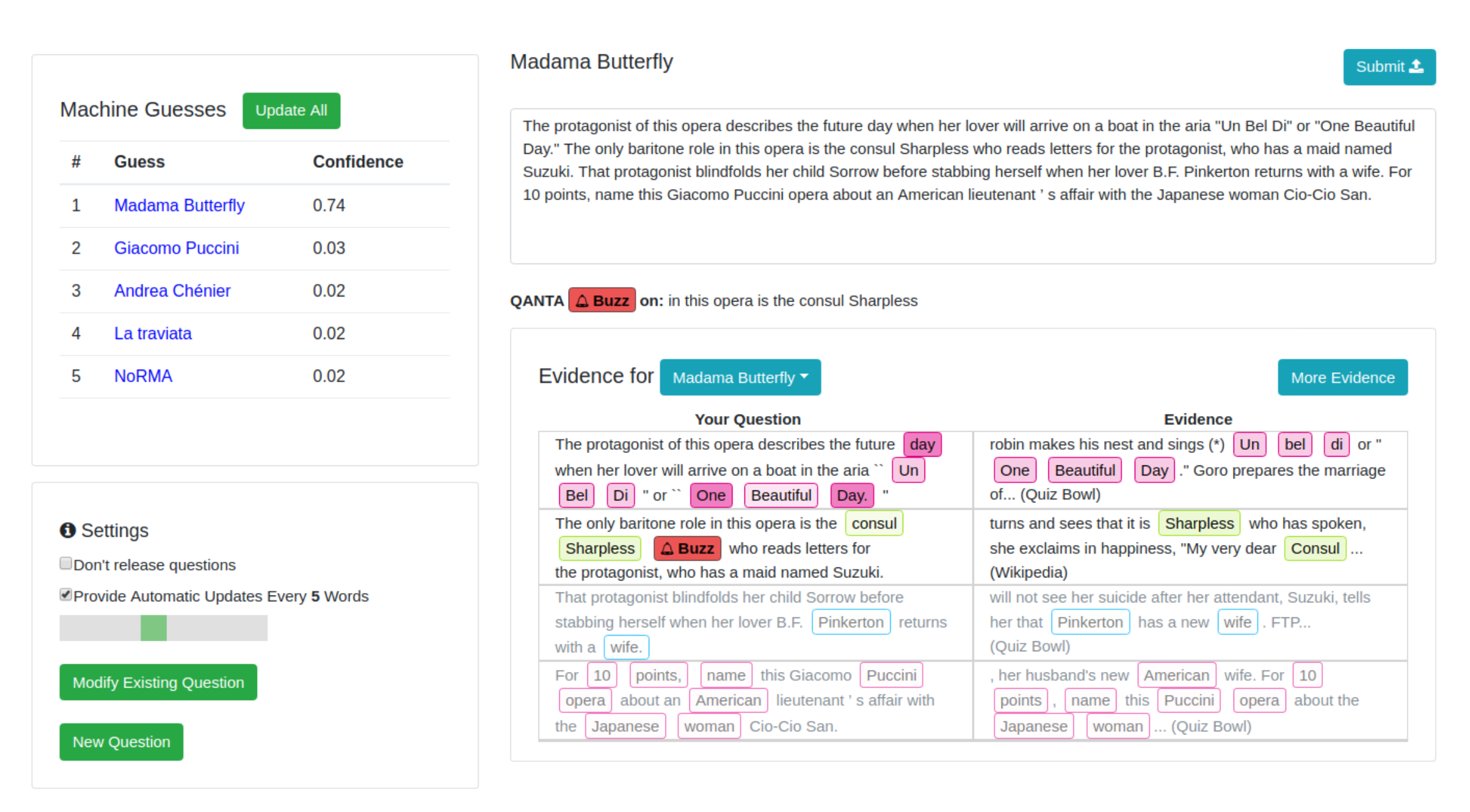 由 Wallace 等人 (2019) 提出的“人类参与的敌对生成”策略,旨在开发工具辅助人类“智破”人工智能模型。在他们的研究中,以 QuizBowl QA 数据集 为基础,他们设计了一套敌对性写作界面。这个界面可以引导用户编写类似《危险边缘》节目风格的问题,目的是让人工智能模型产生错误的判断。系统会根据每个词的重要度来进行颜色高亮显示,这个重要度是通过移除该词后模型预测概率的变化来确定的,具体是通过计算模型对词嵌入的梯度来近似得到的。