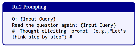 本文介绍了“RE2”提示方法,即在提示中重复两次输入问题。这可以作为一个“即插即用”模块,与各种诱导思考的提示策略(如思维链和程序辅助语言)集成使用。